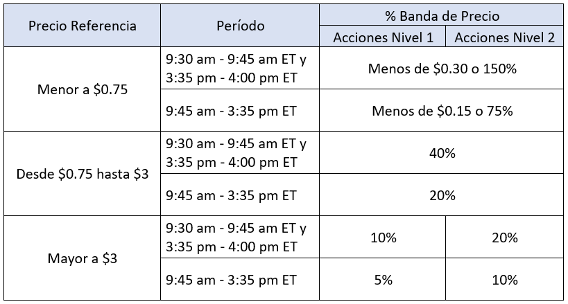 Acciones de nivel 2: todos los demás valores del mercado nacional, incluidos derechos y warrants, y productos ETP más pequeños. Las bandas son del 10-20% para acciones superiores a $ 3.