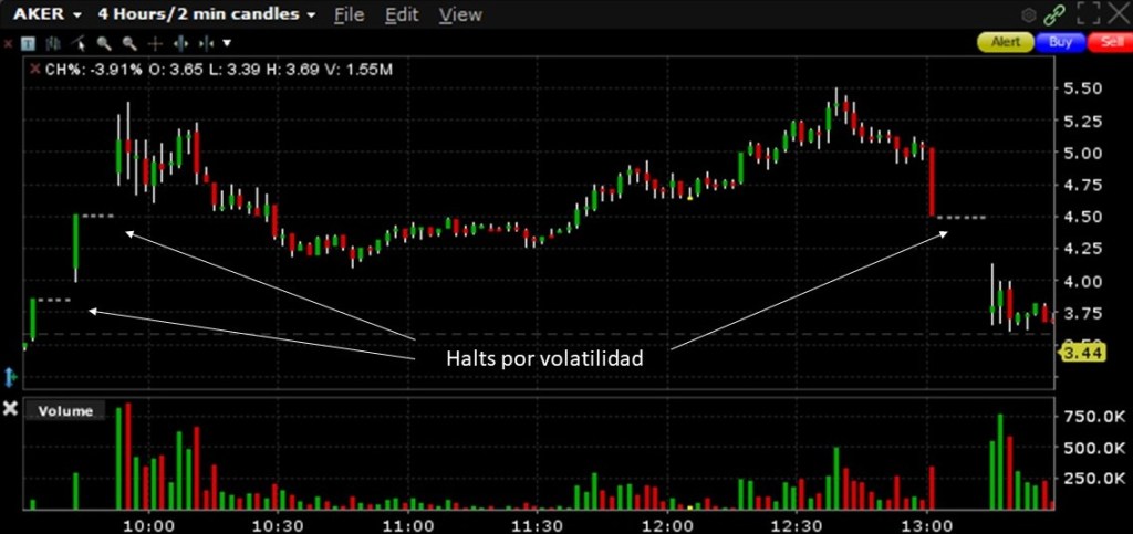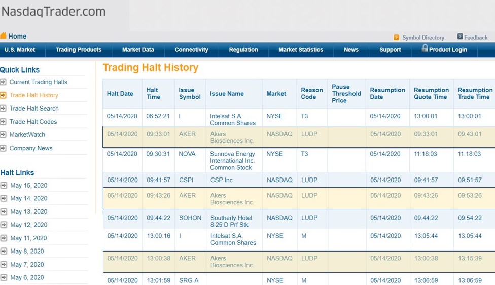 La lista completa de los tipos de halt con su descripción puede encontrarse en la página de nasdaq traders. Y para conocer el código de los halts que se encuentran ejecutados en determinado momento, puedes acceder a su link de actualización automática. En la imagen se observa como se reflejaron los Halts en AKER de la gráfica anterior.