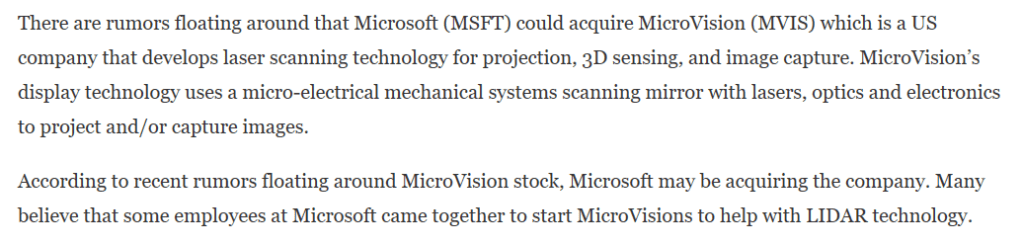 En la última semana uno de los tickers que despertó el interés del mercado fue MVIS, de la compañía MicroVision, relacionada con el sector de la tecnología, cuyo principal desarrollo es Picov, una dispositivo de scanner miniatura, entre otros productos electrónicos. Con un market cap de 109.500 millones de dólares y un float de 126 millones, se podría decir que se encuentra en el límite de lo que generalmente se considera small caps. Sin embargo, estuvo en los scanners de todos los traders dado la alta volatilidad que tuvo en los últimos días.