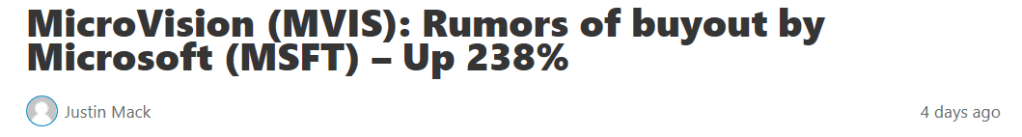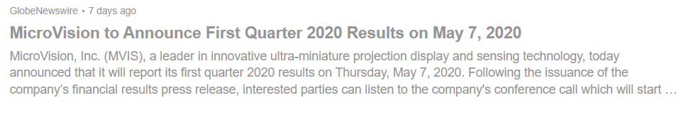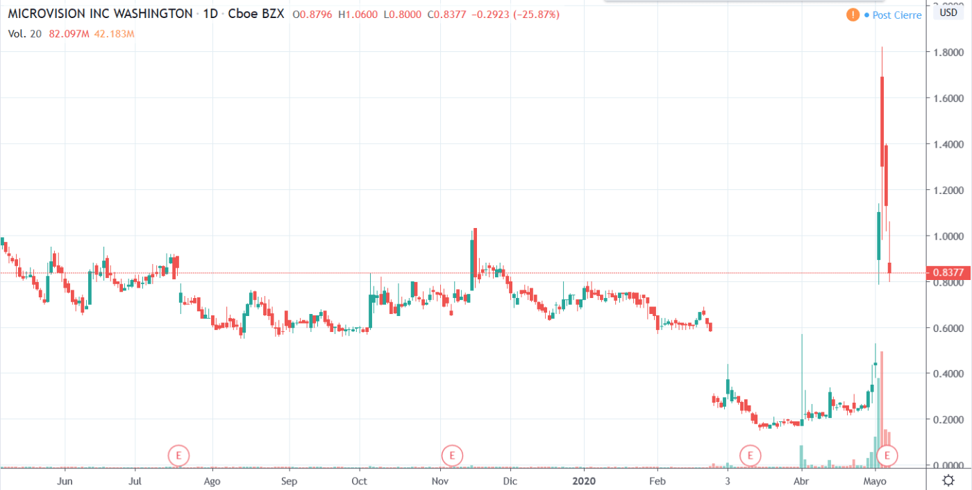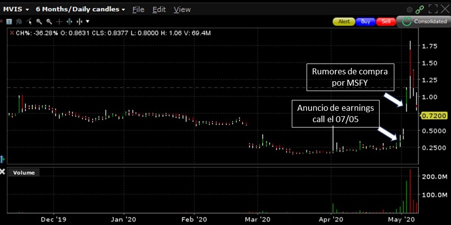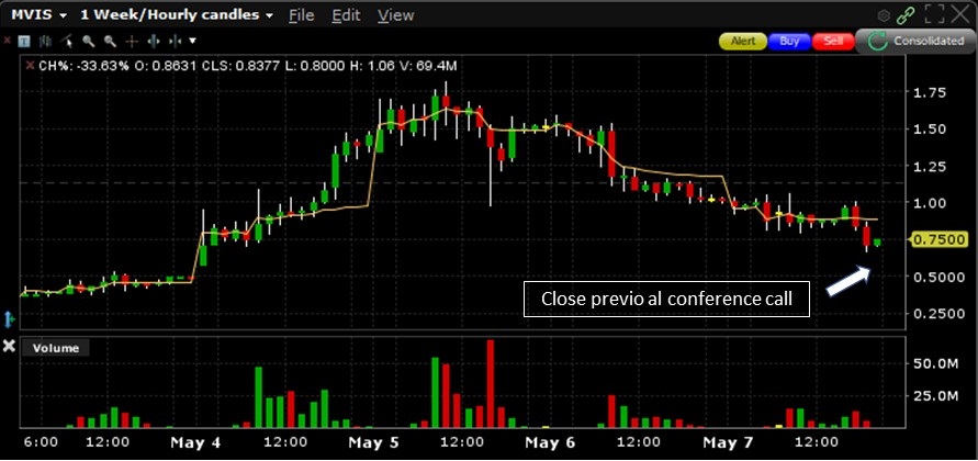 Inicialmente, MVIS tuvo un gap up importante en su precio como consecuencia del anuncio de un conference call que se realizaría el 7 de Mayo, luego de cerrar el horario de cotización. Esto ocurrió el 30 de Abril, e inmediatamente hubo una gran respuesta del mercado, generando una tendencia alcista en la que el precio pasó de $ 0.25 a $ 0.50 en 3 días.