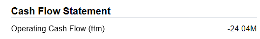 En cuanto al operating cash flow, la empresa pierde anualmente aproximadamente 25 millones de dólares, que a pesar de ser negativo no representa un porcentaje importante de su market cap. En todo caso, no deja de ser una señal de que no ha tenido capacidad de generar el capital necesario para mantener sus operaciones.