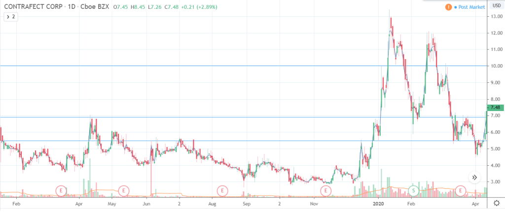 En la gráfica anual de CFRX se observa como los niveles de $5.5, $7 y $ 10, han sido claves en el comportamiento histórico del precio, actuando como resistencia / soporte en diferentes períodos.