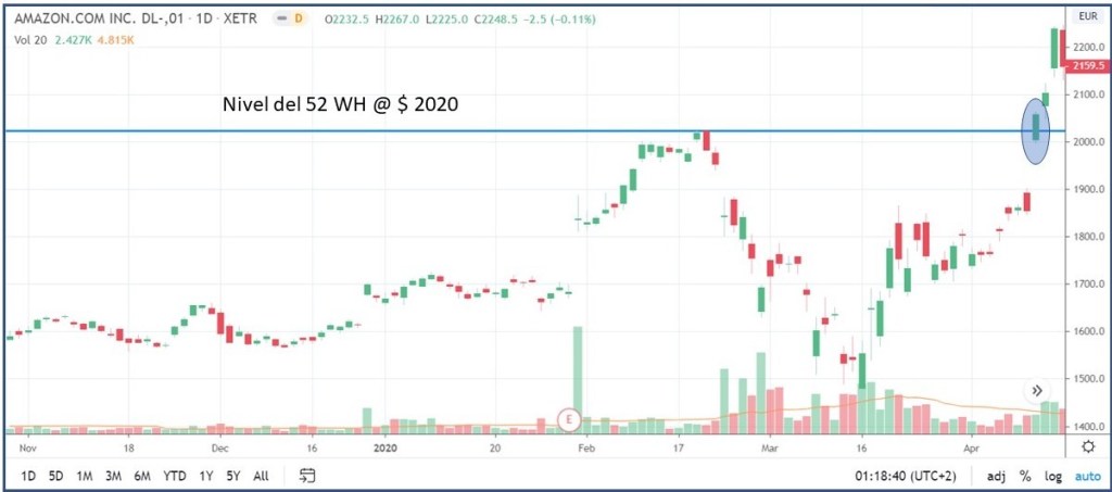 En el ejemplo, supongamos que un operador identifica la tendencia alcista que viene desarrollando Amazon luego de la debacle general de finales de Febrero como consecuencia del COVID 19. El nivel de $2020 del 19 de Febrero representa el valor más alto que había tenido la acción en el último año, por lo que significa un nivel clave para los operadores.