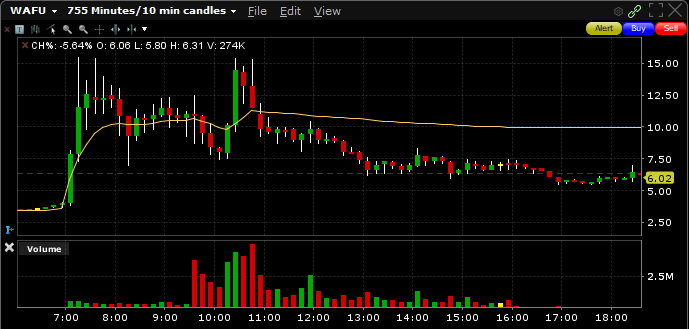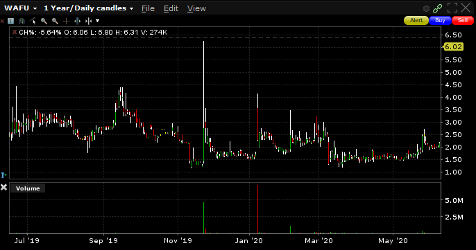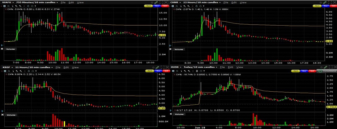 Entre todas estas, se puede identificar un sector que ha tenido un comportamiento característico por simpatía o “Symphaty Plays”, el de las Low Float Chinas. Tickers como WAFU, CHNR, KBSF, HUSN entre otras, han tenido comportamientos de Pump and Dumps que se han repetido constantemente a lo largo del mes. A continuación una descripción de sus principales características: