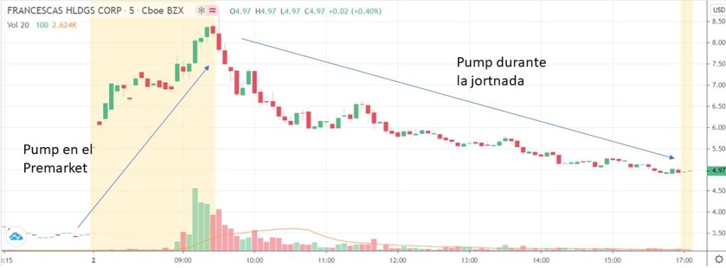 El pump and dump es un esquema que intenta aumentar el precio de una acción a través de recomendaciones basadas en declaraciones falsas, engañosas o muy exageradas. Los autores de este esquema ya tienen una posición establecida en las acciones de la compañía y venden sus posiciones después de que el pump haya llevado el precio de la acción a un valor más alto. Esta práctica es ilegal basada en la ley de Valores y puede conducir a fuertes multas.