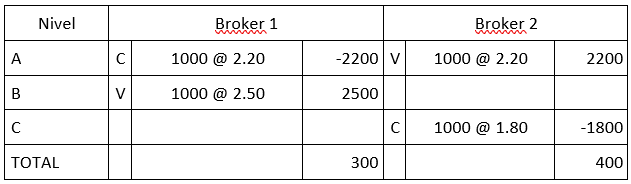 Si por el contrario, el precio en el Nivel A hubiera roto hacia abajo sin bounce, se podría vender la posición del Broker 2 para quedarse con la posición en corto del segundo, estimado que el bounce no se dará y comenzaría el fade hacia C.