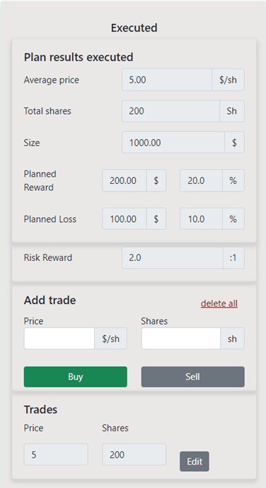 La sección Executed permite registrar las entradas y salidas que efectivamente se realizaron en el trade, de manera que puedan ser tomadas en cuenta para el calculo del plan en caso de que se planifique una nueva entrada. Además, el programa te indicará los resultados de las ejecuciones realizadas: Risk Reward, potencial ganancia o pérdida en los niveles de recompensa y riesgo. Si por ejemplo en el caso anterior se decide tomar una posición en 5 pero sólo con la mitad de las 400 acciones sugeridas, al ingresarlas en Executed el sistema indicará los resultados hasta el momento de esa ejecución
