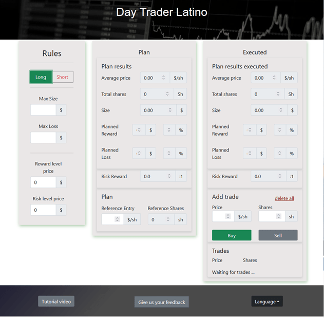 En Day Trading Latino, hemos desarrollado una herramienta gratuita que sin duda será muy útil para el manejo del risk management, independientemente de la estrategia, temporalidad o mercado en el que se tradee. Se basa fundamentalmente en el cálculo del número de acciones que deberías operar en determinado precio en función del riesgo, la pérdida máxima por trade y la posición máxima en dólares con la que normalmente operas.