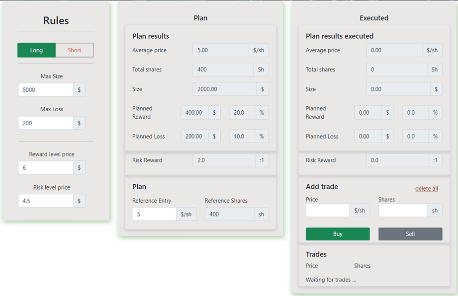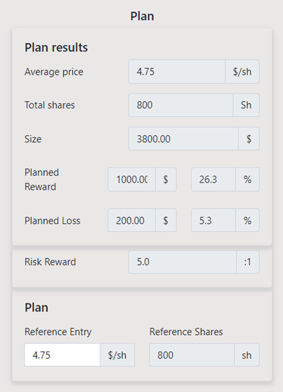 Una vez definidos los criterios anteriores, en la sección Plan se colocará el precio en el que se planifica hacer una entrada al trade, y la calculadora nos indicará el número de acciones que debemos comprar – o shortear – en ese precio para no superar los valores de Max Size y Max Loss establecidos en las Reglas.